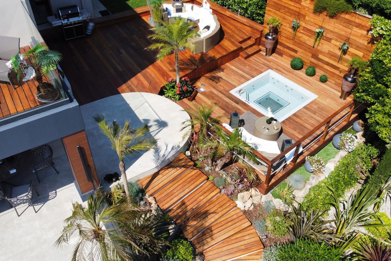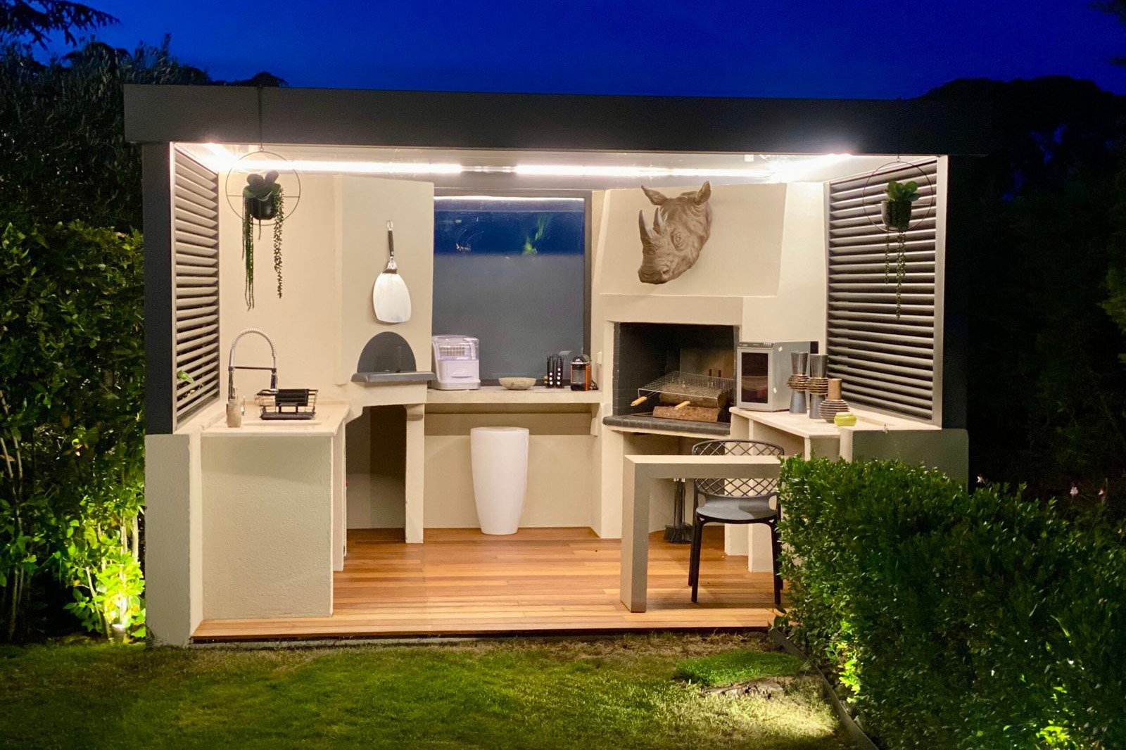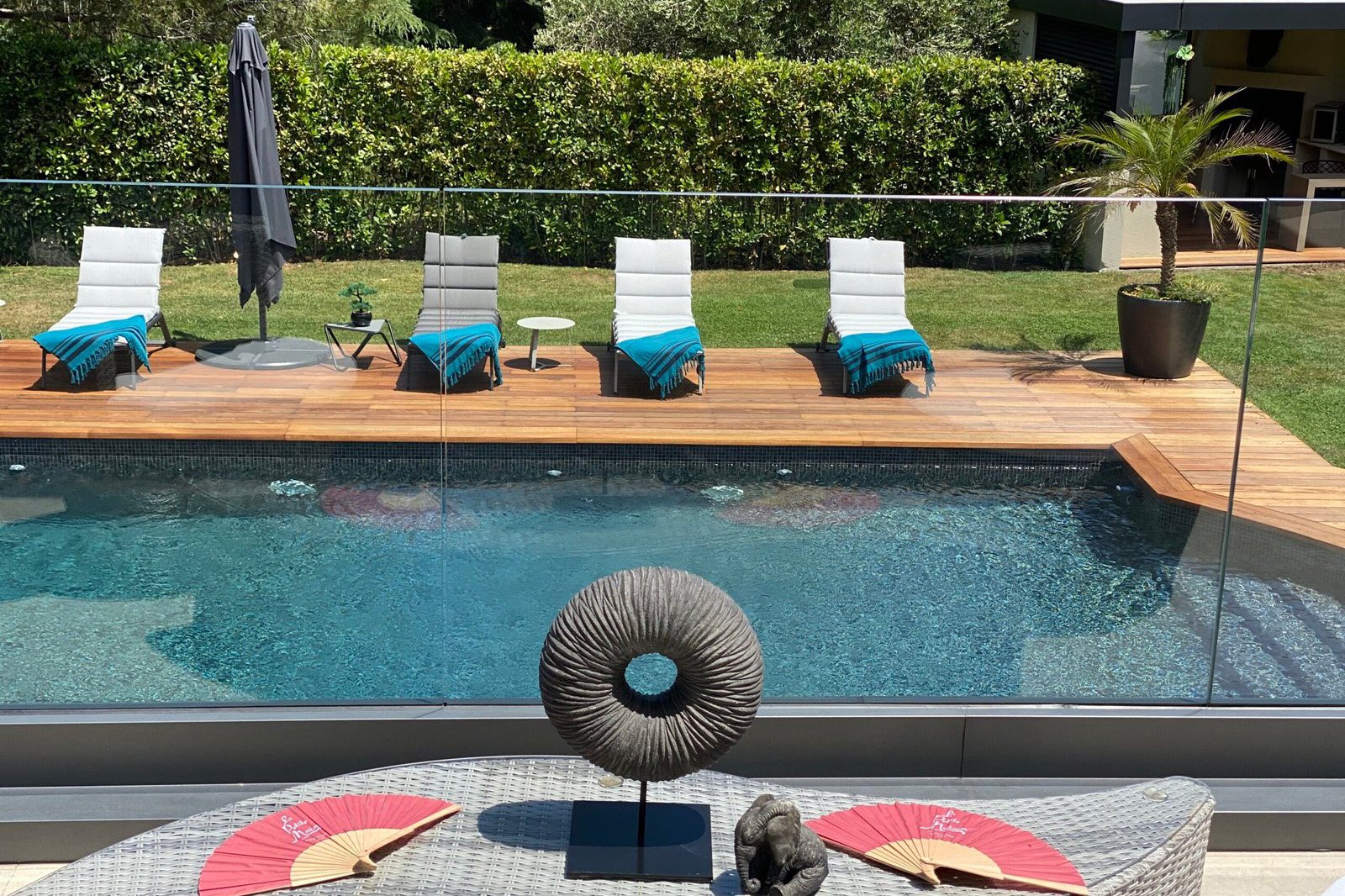 Villa L’Oiseau is enveloped in a lush green setting, featuring a variety of outdoor spaces including a jacuzzi and relaxation area, a swimming pool, mini-golf, an outdoor cinema, and a kitchen, ensuring delight for all.