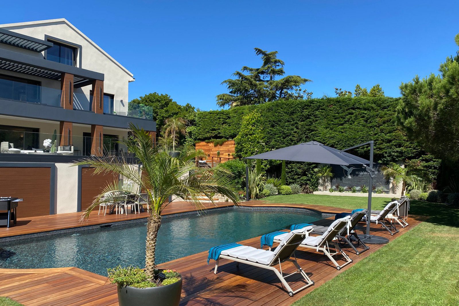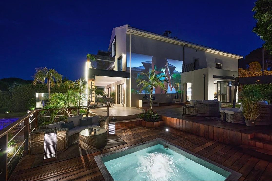 Conveniently located, the villa is just 8 minutes from the Croisette, 15 minutes from Antibes, 30 minutes from Nice airport, and 20 minutes from a private airport, with shops only 3 minutes away.